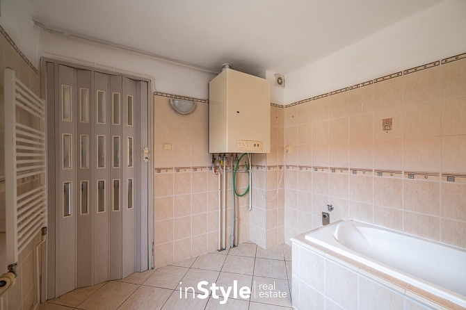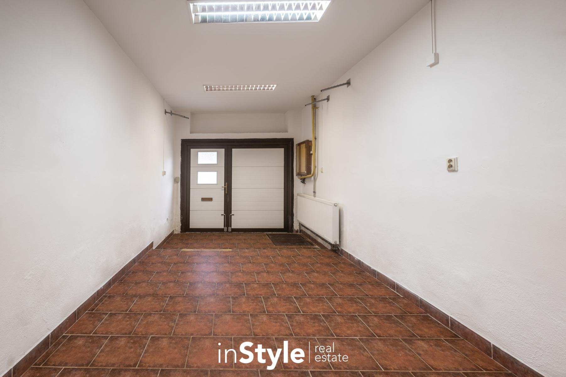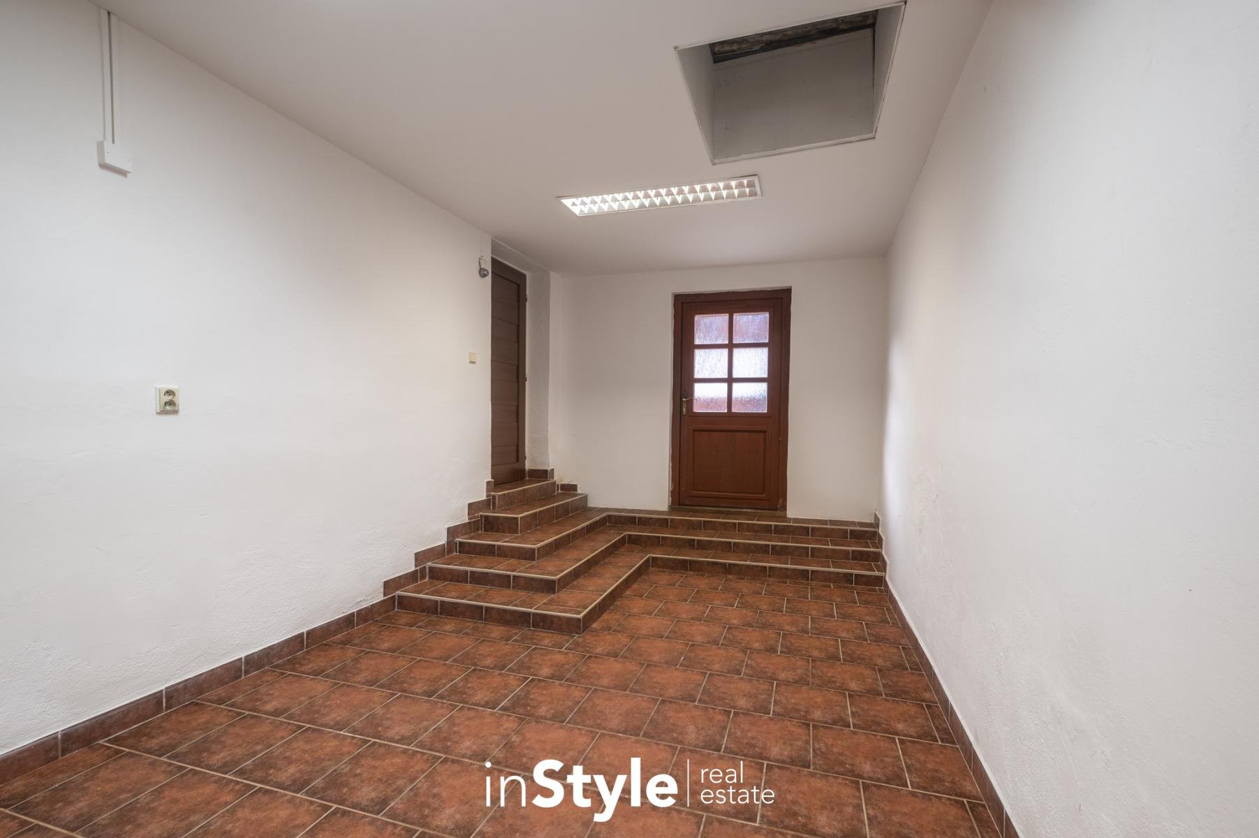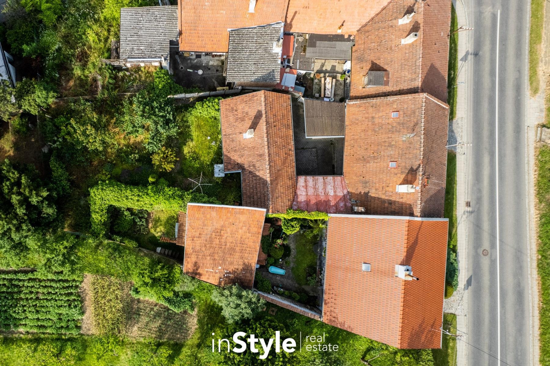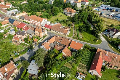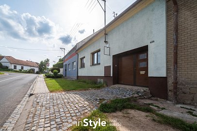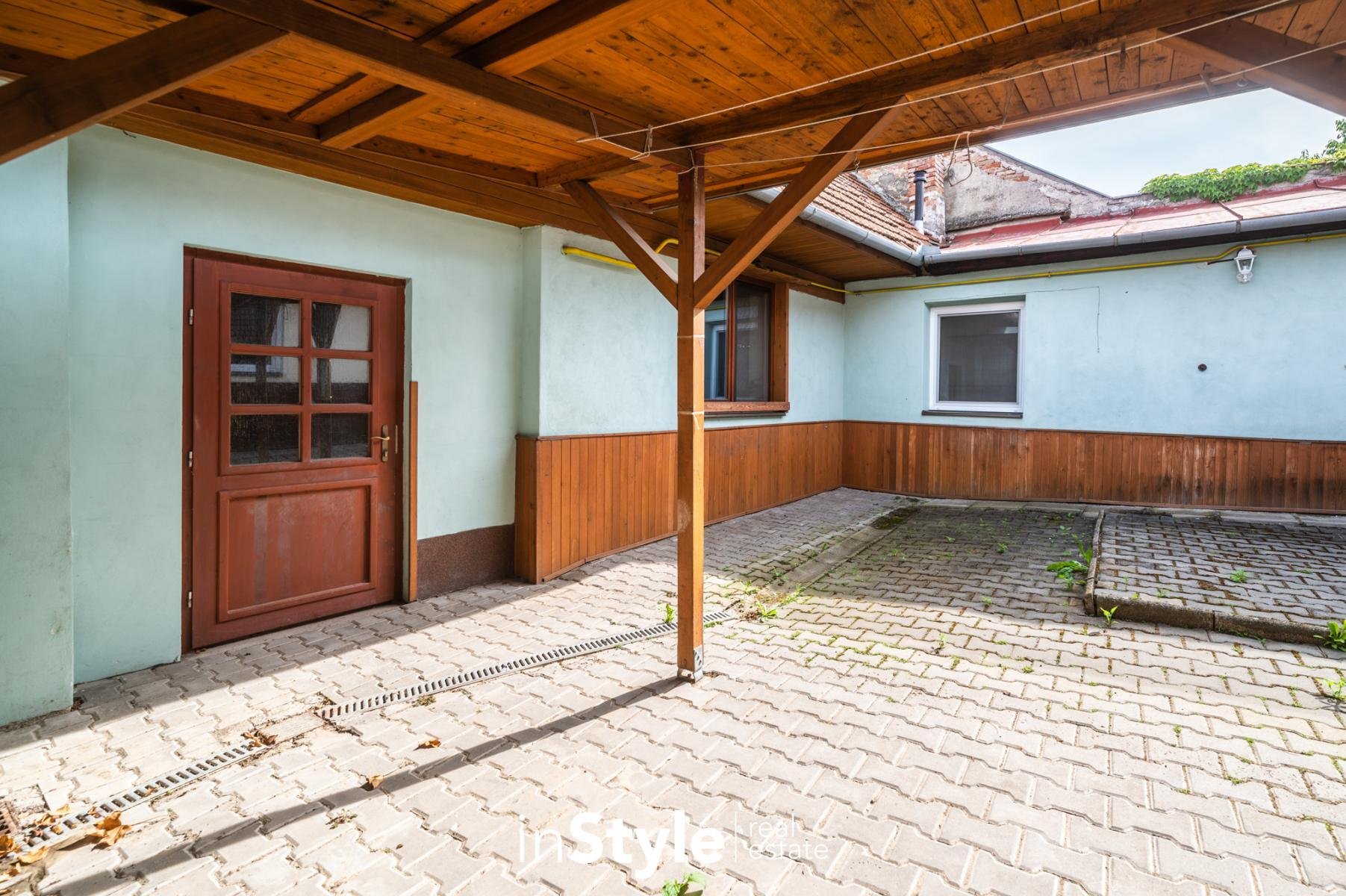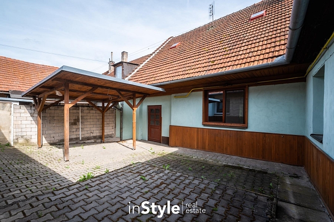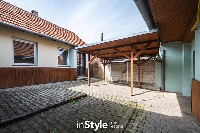 Součástí rodinného domu je také garáž s přímým průchodem na menší dvůr, kde je k dispozici pergola určená pro posezení. Skrze dvůr se dostanete do hospodářského zázemí s menší dílnou, vinným sklepem a zahradou.