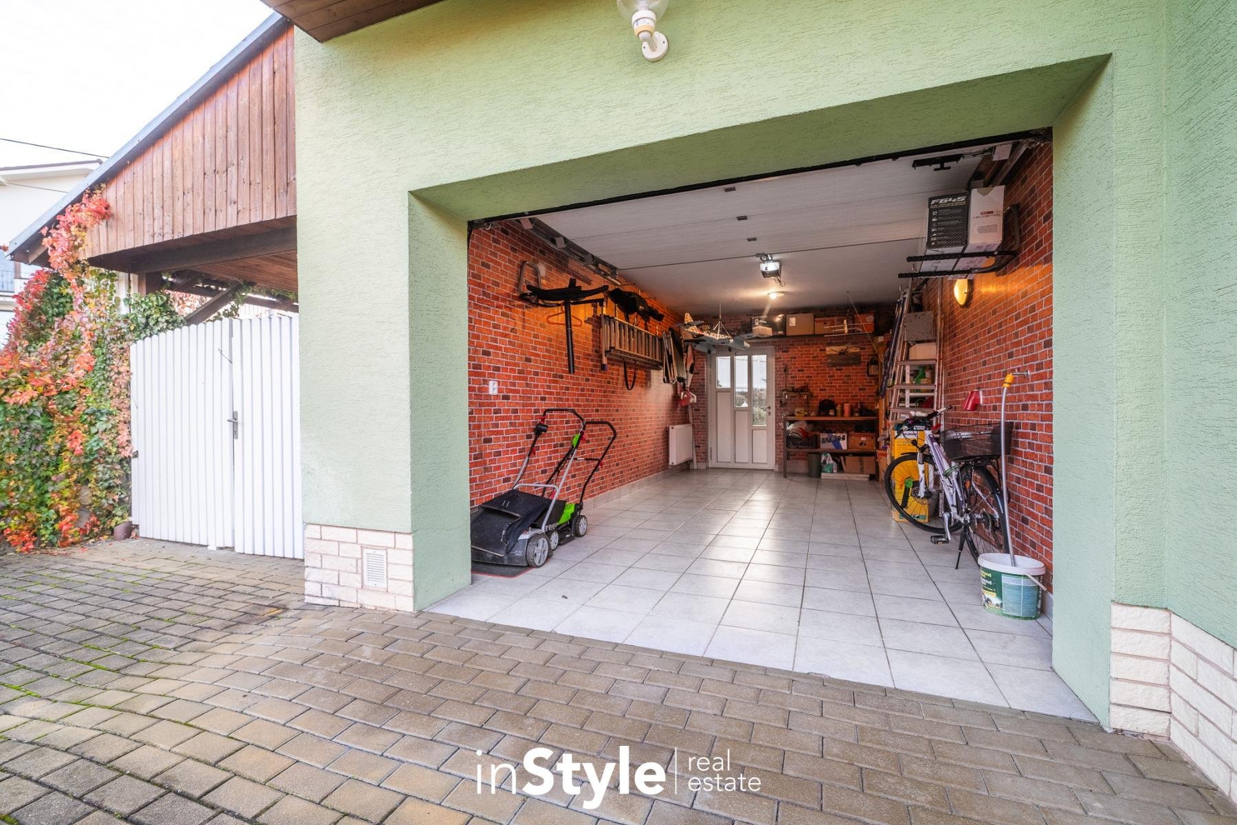 Zároveň je nesmírnou výhodou, že na vlastním pozemku můžete odparkovat až čtyři osobní automobily. Jeden vůz můžete parkovat v garáži, jeden pod přístřeškem a dva vozy na vlastní části zpevněného pozemku přímo před domem. Garáž, parkovací plocha i venkovní přístřešek, které se nachází přímo vedle vstupu do obytné části rodinného domu, jsou plně přístupné i ze strany zahrady.
