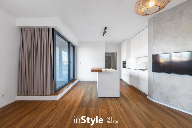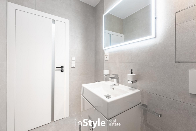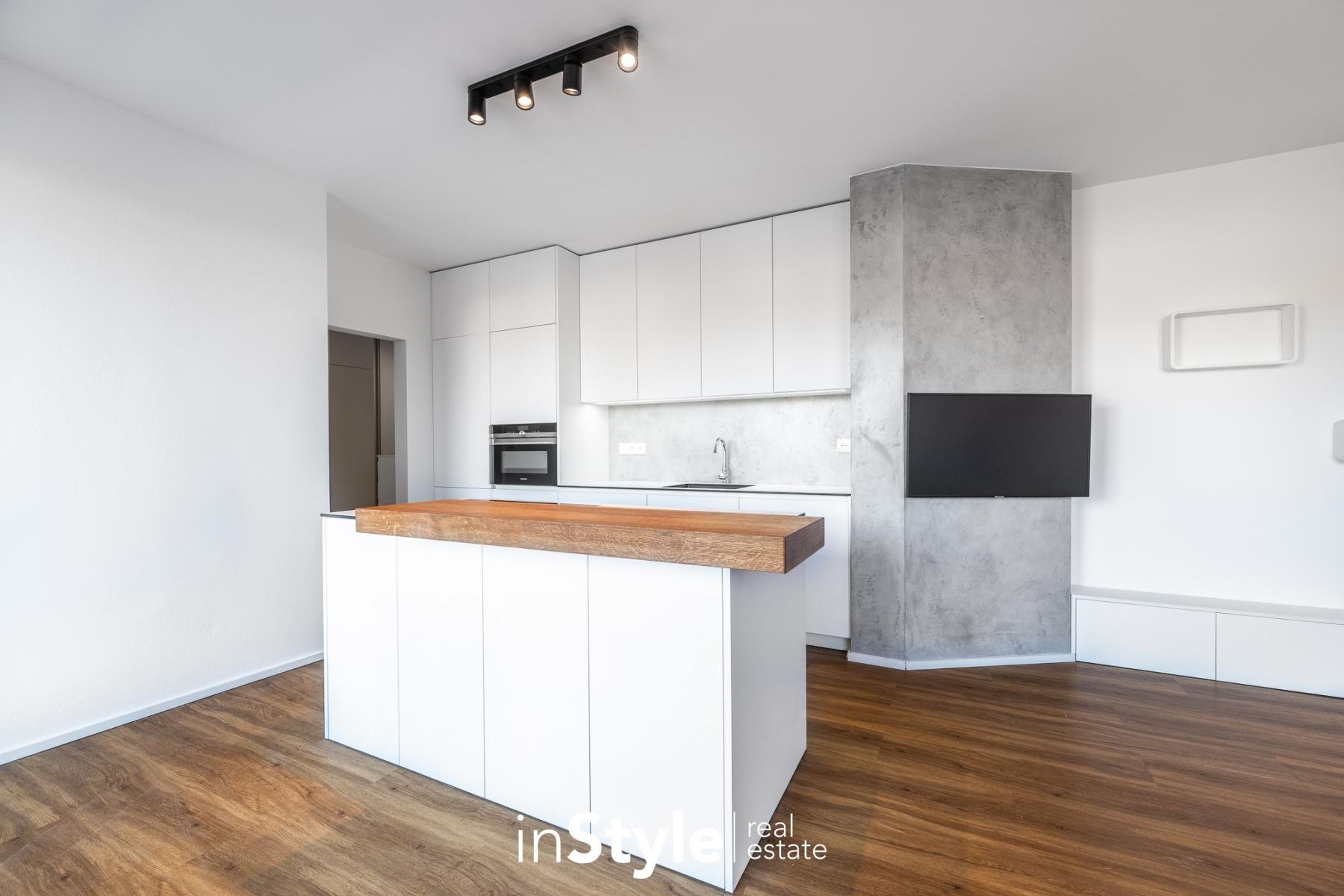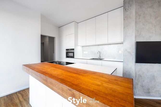 V celém bytě jsou použity nadstandardní materiály a vybavení, které je součástí a předmětem nájmu. Majitel nemovitosti v bytové jednotce ponechává osvětlení, závěsy, vestavné skříně a kuchyňskou linkou se zabudovanými spotřebiči - lednice s mrazákem, myčka, pečící trouba a nadstandardní varná deska BORA se zabudovaným spodním odtahem.